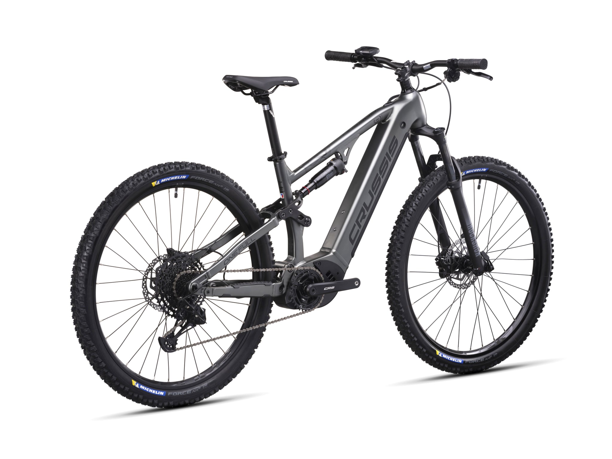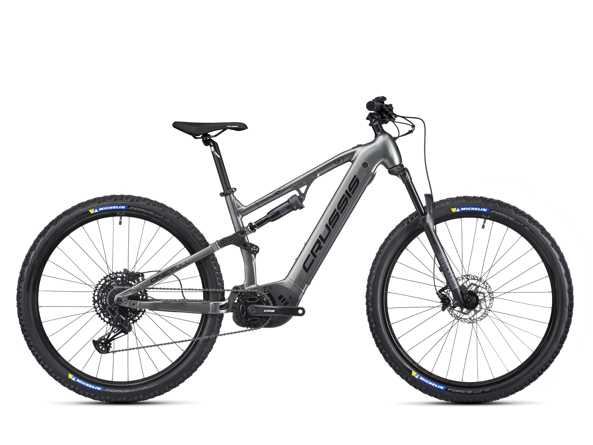 Crussis ONE E-Full 9.10 je električno gorsko kolo z aluminijastim okvirjem, udobno geometrijo in kolesi premera 29”Kolo poganja pogonski motor PANASONIC GX Ultimate s kar 95Nm navora , ki je nameščen na sredini kolesa, na optimalni lokaciji z vidika ravnotežja in voznih lastnosti. Baterija 720Wh je vgrajena v okvir kolesa katero lahko tudi zelo enostavno snamemo  s priloženim ključem. Domet je do 170km (odvisno od profila steze in načina uporabe pomoči). Udobje v vožnji izboljšuje vzmetena vilica in zadnje vzmetenje Rock Shox, udoben sedež, hidravlične disk zavore in pnevmatike MICHELIN FORCE AM2 COMPETITION LINE TS TLR 29 x 2,60  - garancija za popolno vožnjo po cesti in brezpotjih.
